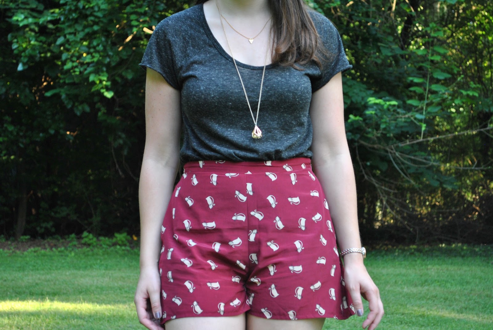 I'm really surprised that I haven't shown these shorts on the blog before. I basically live in them. They're ridiculously comfy, I feel like I'm wearing pajamas whenever I put them on. I picked these up on sale at Forever 21 when I was in New York City. I love all things high waisted and I couldn't resist the cat print. And, as you will see from the title of this post, I also can't resist making feline-related puns when wearing these shorts.